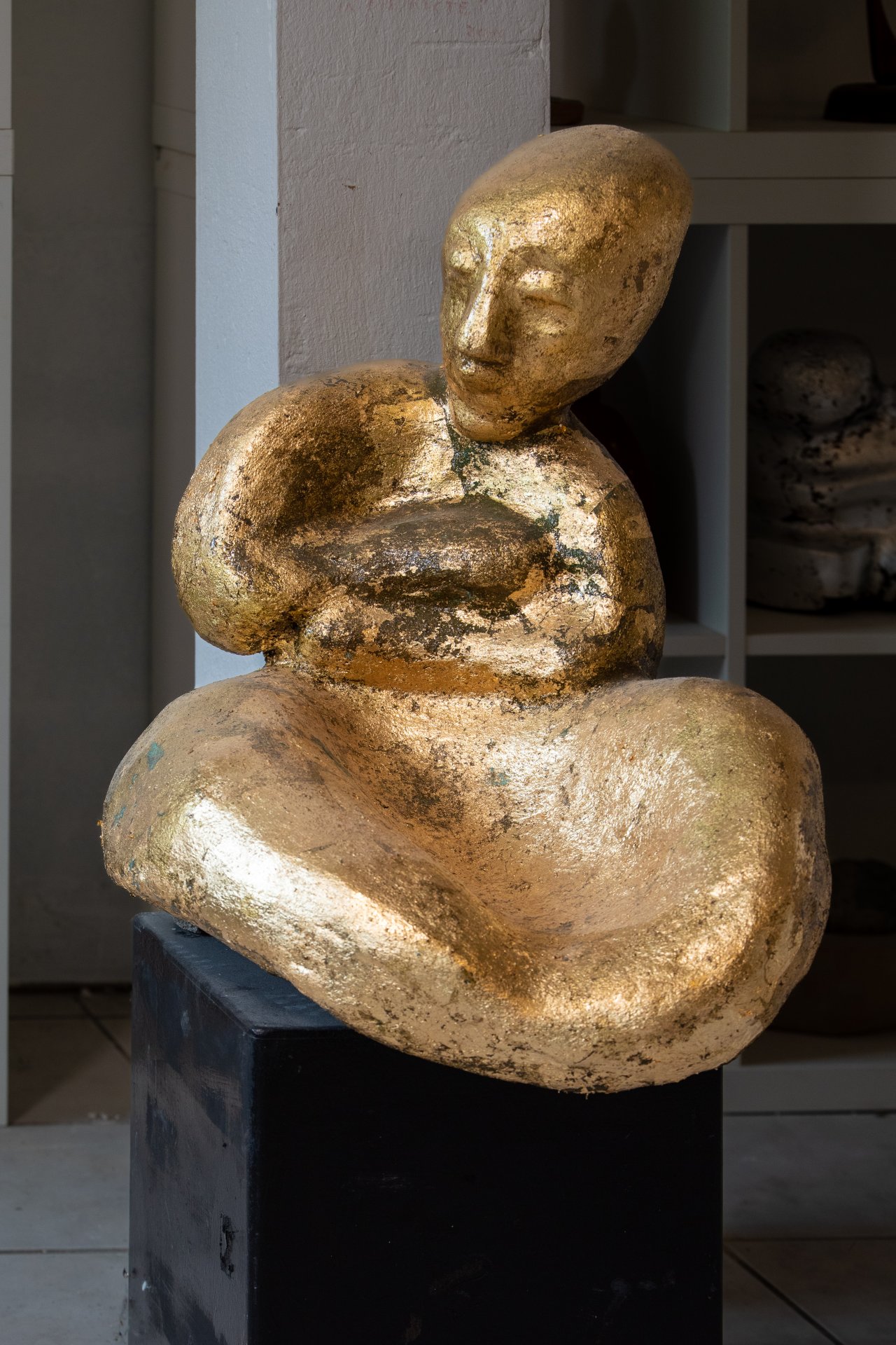 MIT dübeln und Zement fügte ich die Teile zusammen, doch die Materialien schienen mir nicht zusammen zu passen. Also gab ich der ganzen zusammengesetzten Figur eine Betonhaut. Ich formte sie aus Knetbeton, bis die Figur für mich wieder „heil“ aussah, und glättete den Beton. Nach der Trocknung vergoldete ich sie mit Blattgold und setzte sie zum Trocknen in die Sonne vor dem Atelier.
