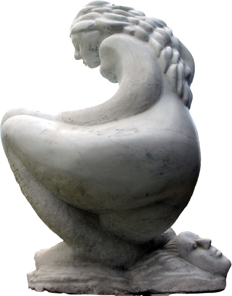Er „antwortete“ mit einem zarten weiblichen Gesicht an der Stelle, an der Adlerkopf (nun ohne Schnabel) hätte sein sollen. Als ich es herausarbeitete, folgte eine wallende Haarpracht, ein mädchenhaft kleiner Busen und ein massiger Unterleib – und wieder hatte ich ein Zwitterwesen vor mir. Aber ein Fischschwanz war in dem noch kompakten, massigen Block, aus dem der Unterleib bestand, noch nicht sichtbar.