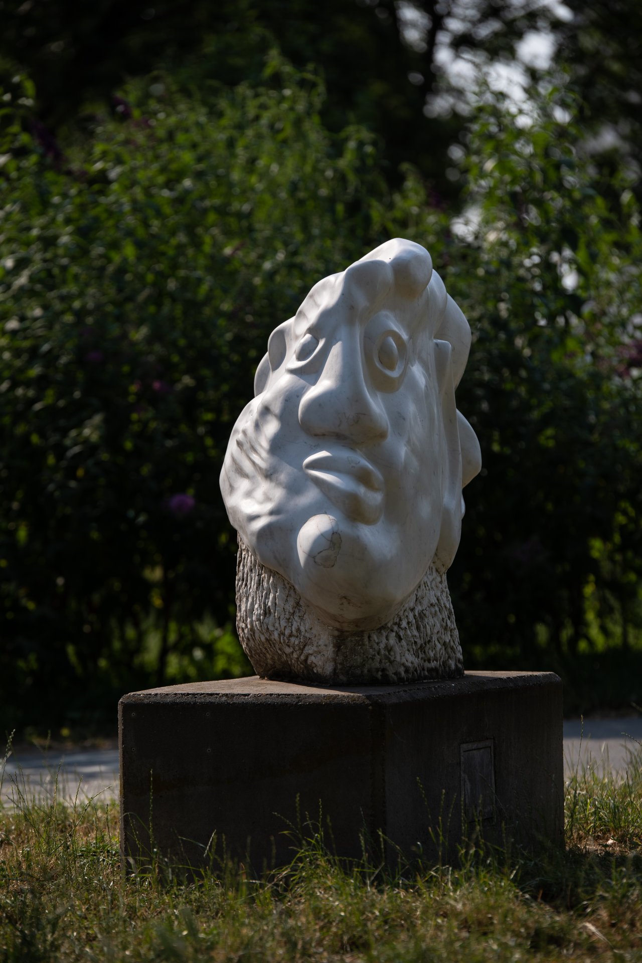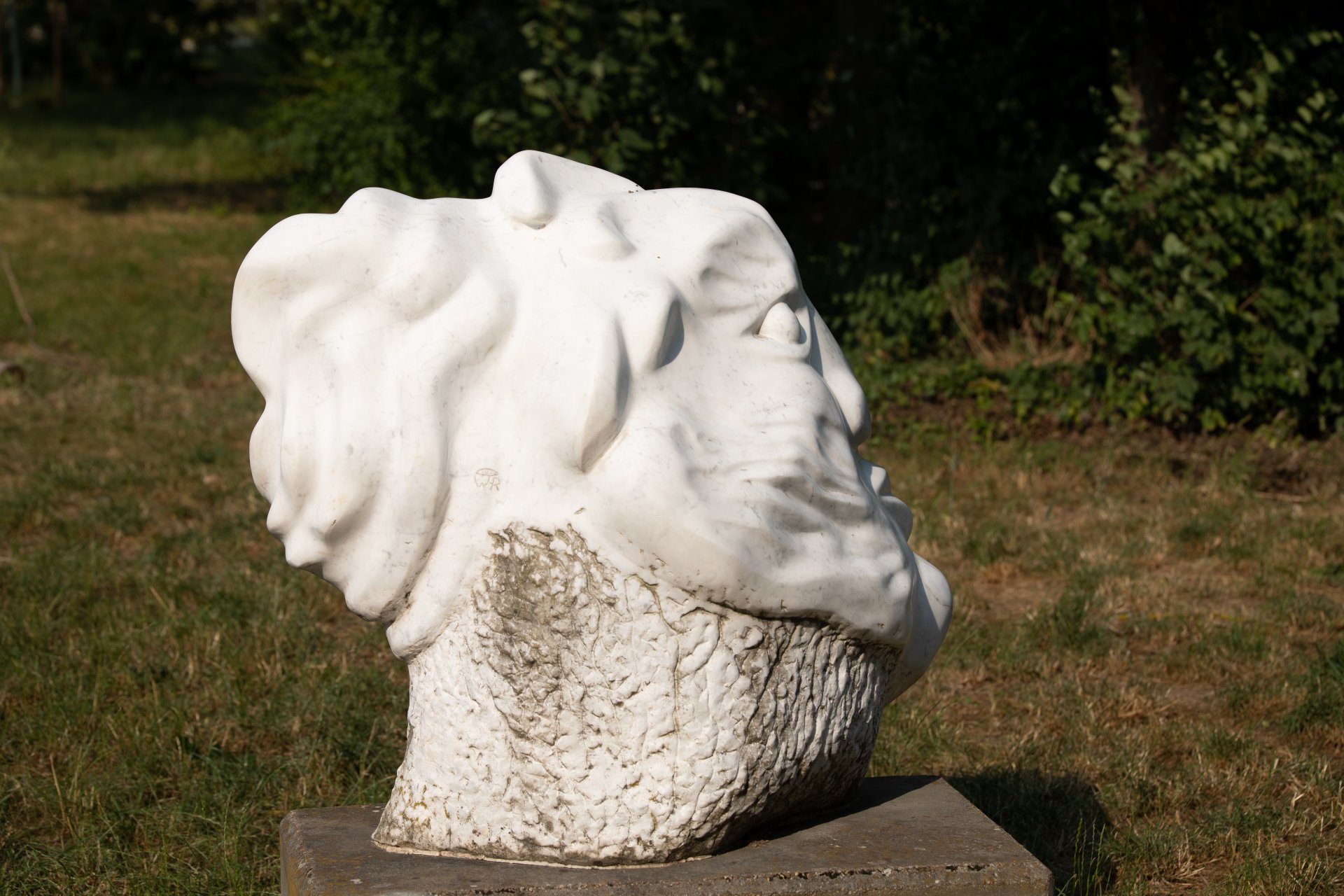 Der Hals ist nur grob behauen und wirkt wie ein Fels, aus dem der Kopf herauswächst.
